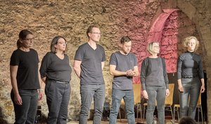 Dies ist die Königsdisziplin der Charmeützels! Einige Wochen vor der Aufführung tauscht sich das Ensemble philosophisch und persönlich zu einem bestimmten Thema aus. Zugleich wird das anspruchsvolle Format einstudiert bzw. aufgefrischt: eine Long-Form, bei der die Szenen in assoziativer Folge ineinander übergehen. Zwischendurch werden Zettel vorgelesen, die vor der Aufführung von den Zuschauern zum Thema beschrieben werden. Manchmal werden auch Bilder projiziert und sodann bespielt. Immer ist ein Musiker dabei, der ein Lied begleitet oder auf eine neue Szene einstimmt. Bisher wurden folgende Collagen zur Aufführung gebracht: "Endstation Eden - oder: Über den Traum der Unsterblichkeit" (2014), +++ (Theater-Collage über das Symbol des Kreuzes im Rahmen der "Stillen Tage 2015"), “Geld” - im Rahmen der Ausstellung von Andreas Mayer-Brennenstuhl in Neuhausen/Fildern (2017) und “Nürtingen 2045” im Rahmen der BUND-Aktionstage vor dem Welthaus in Nürtingen (Juli 2024). Näheres zu einigen dieser Aufführungen findet sich unter "Ensemble Improvisieren", unter welchem Namen die Collagen zunächst gezeigt wurden.