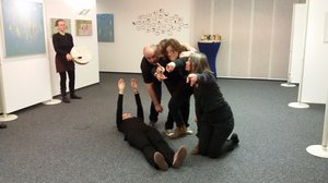 Vielleicht haben Sie schon einmal gesehen, wie drei, vier Spieler*innen in einer Reihe stehen und eine Geschichte spontan entwickeln: der Moderator schnippt und schon hört jemand mitten im Wort auf zu erzählen und jemand anders setzt genau da ein. Oder das Freeze-Spiel: Zwei Spieler*innen bestreiten eine Szene, eine andere klatscht, die beiden, die gerade spielen, frieren ein; die, die geklatscht hat, löst eine der beiden Spieler*innen ab und beginnt exakt in deren Körperhaltung eine völlig neue Szene. Oder: Die A-B-C-Szene, wo die ersten Sätze eines Dialogs jeweils in der Folge des Alphabets beginnen. Diese und viele andere bekannte und unbekannte Impro-Spiele zeigen wir in Theaterräumen - oder bei Ihrer Feier!